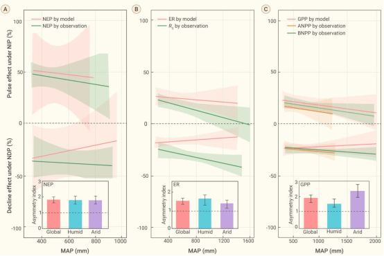 研究还发现土壤含水量是导致生态系统碳汇对降水改变非对称响应的关键因素。在干旱地区,在降水增加处理下,土壤含水量增加了30.86%,而在降水减少处理下,土壤含水量减少了-20.21%,土壤含水量对降水改变表现为正的非对称性响应。这与上文提到的生态系统碳汇的响应模式一致(图1A)。但干旱区和湿润区生态系统碳汇非对称响应的调控机制不同(图2)。在干旱地区,生态系统碳汇的正非对称响应主要来自植被生产力的正非对称性响应(图2A);而湿润地区生态系统碳汇的正非对称性主要来自于土壤呼吸过程中负非对称性响应,即降水处理下土壤呼吸减少量高于降水增加处理的增加量(图2B)。