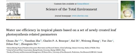 在全球气候变化的背景下,水分利用效率(WUE)作为植物适应环境变化的重要指标,已成为生态学研究中的关键参数之一。植物的水分利用效率反映了其在光合作用过程中每单位干物质积累所消耗的水量,这一参数不仅揭示了植物的水资源利用效率,也与植物的生长、适应策略以及应对环境压力的能力密切相关。然而,现有的WUE研究大多集中在稳定环境下的瞬时水分利用效率(WUEi)上,忽视了自然光照波动对植物WUE的影响。为此,本研究创新性地提出了一套与WUE相关的全新参数,包括最大水分利用效率(WUEmax)、水分潜力系数(WPC)、水分损失系数(WLC)、水分策略系数(WSC)和水分综合系数(WTC),对48种典型热带植物的水分利用效率进行了全面评估,旨在更准确地评估热带植物在自然光变化中的水分利用策略。本研究于2024年11月以“Water use efficiency in tropical plants based on a set of newly created leaf photosynthesis-related parameters”为题发表于生态环境领域著名期刊Science of the Total Environment(一区Top,5年IF: 8.6)。