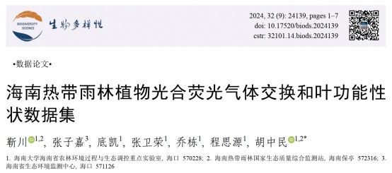 在热带雨林中,光照、温度和水分等环境因素复杂交织,使植物的光合特性展现出丰富多样性。由于热带雨林的恶劣环境和野外测量工作的复杂性,获取详细的植物叶片光合生理数据极具挑战。鉴于此,研究团队在海南保亭七仙岭温泉国家森林公园使用2套便携式光合测量仪等设备对当地48种优势物种进行了叶片光合生理相关观测。研究团队将数据整理成数据论文,向学术界分享这些发现。本研究于2024年11月以“海南热带雨林植物光合荧光气体交换和叶功能性状数据集”为题发表于生态领域著名期刊生物多样性(中国科技期刊卓越计划期刊)。