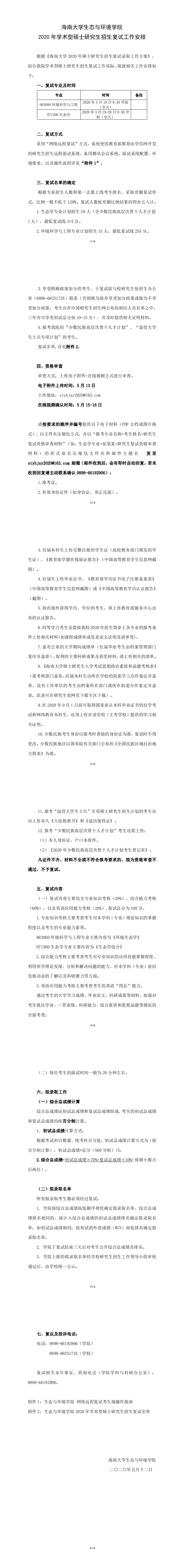 海南老员工态与环境公司 2020 年学术型硕士研究生招生复试工作安排