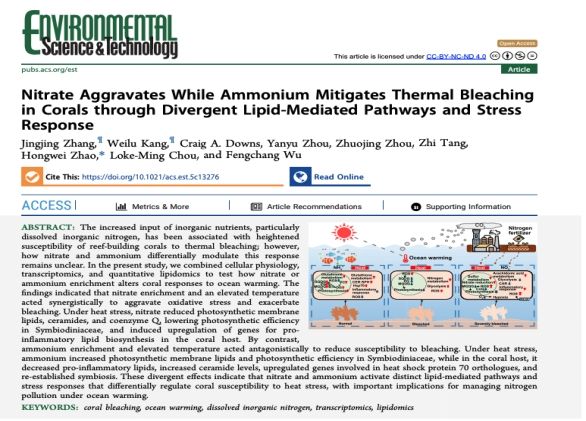 近日,一项由伟德国际1946海南省珊瑚礁生态学国际联合研究中心赵洪伟教授科研团队完成的重要研究揭示了不同形态的氮污染物——硝态氮和铵态氮,在国家一类海水水质相关浓度下,对受热胁迫的珊瑚会产生截然相反的生理效应。该研究成果为深入理解气候变化与营养盐污染复合作用对珊瑚礁生态系统的影响提供了全新视角,并首次提出了一个可指导水质管理的具体硝酸盐浓度阈值。相关论文已发表于Nature Index收录期刊《Environmental Science & Technology》。