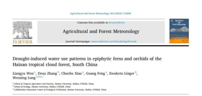 论文题目为《Drought-induced water use patterns in epiphytic ferns and orchids of the Hainan tropical cloud forest, South China》,发表在Agricultural and Forest Meteorology期刊,硕士研究生文良玉为第一作者,龙文兴教授为通讯作者。该研究所设计的控制实验装置获得国家发明专利授权,得到了国家自然科学基金面上项目(31870508)资助。(https://doi.org/10.1016/j.agrformet.2025.110400)