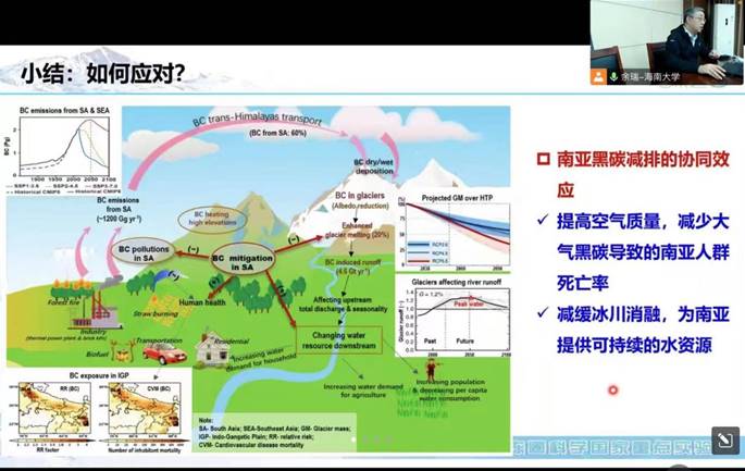 在报告中,康世昌研究员围绕冰冻圈特别是青藏高原冰冻圈独特性和重要性,从大气污染与青藏高原冰冻圈变化的背景出发,对青藏高原黑碳气溶胶的时空分布特征、黑碳气溶胶跨境传输过程以及黑碳对冰冻圈消融的影响评估等三个方面,用实地取样调查数据结合多种技术和分析手段,深入分析了第三极大气污染与冰冻圈退缩的耦合机制。他指出,南亚等周边地区的大气污染物可通过高空和山谷输入青藏高原并加速冰冻圈消融,而上述过程会进一步加速黑碳及其他污染物的累积从而形成恶性的闭环,最终对区域生态环境造成潜在影响。最后,他强调青藏高原作为下游印度等南亚国家重要水源来源,南亚黑碳减排将产生协同效应。通过提高空气质量,不仅可减少大气黑碳导致的南亚人群死亡率,同时可减缓冰川消融,为南亚提供可持续的水资源。