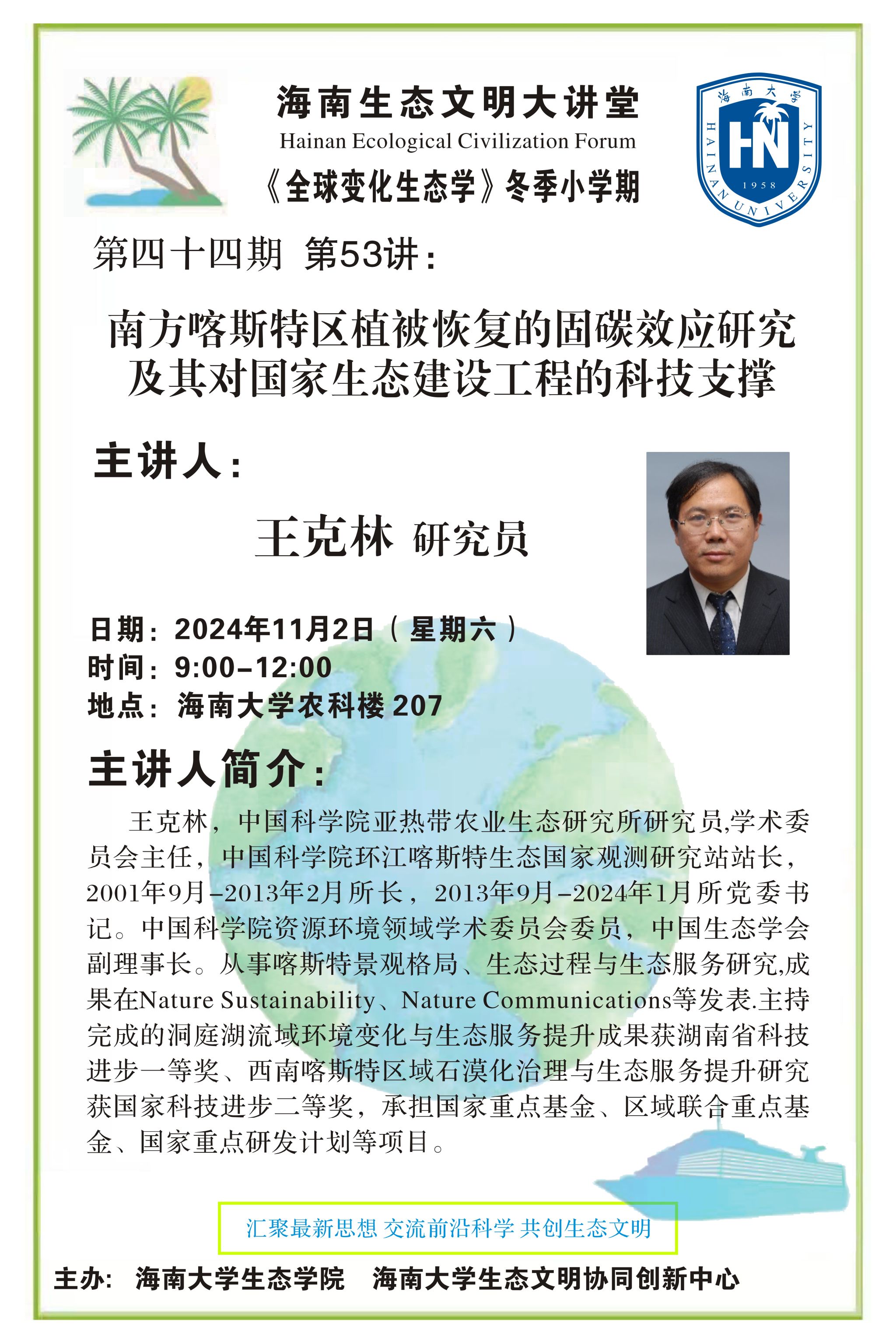 第53讲 王克林研究员做客海南生态文明大讲堂以及《全球变化生态学》课程冬季小学期
