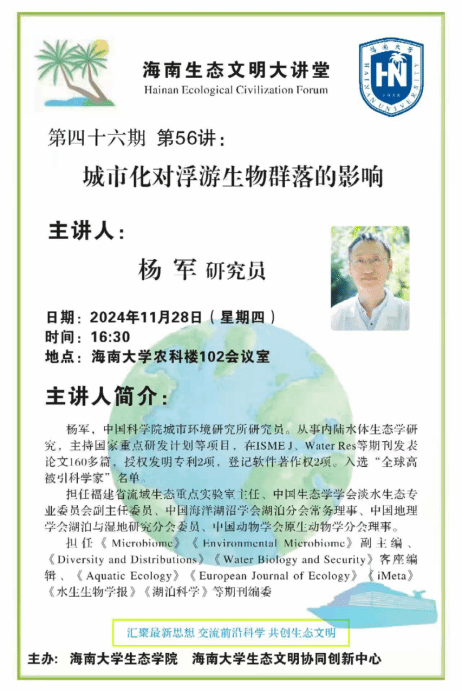 此次报告不仅展示了杨军研究员在水生态安全领域的创新研究成果,还强调了在城市化流域中,水生生物群落构建机制研究对于水生态健康与服务功能的重大意义。