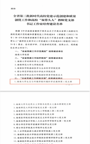 10月18日,海南省教育厅遴选产生了一批全省党建工作示范高校、党建工作标杆院系、党建工作样板支部和“双带头人”教师党支部书记工作室。公司环境科学系教师第二党支部授予“全省党建工作样板支部”荣誉称号。